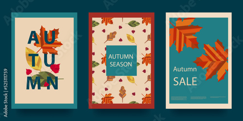 Autumn abstract poster in modern hipster style. Geometric shapes. Trendy modern art with autumn leaves.