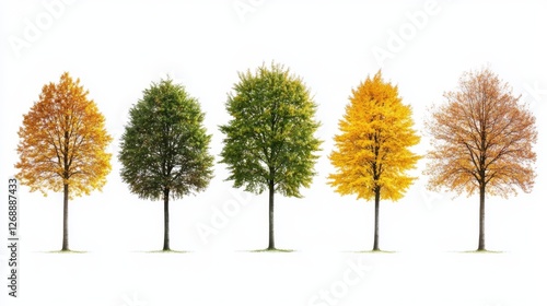 Autumn and summer trees isolated on white background featuring oak, maple, linden, and birch trees with vibrant green and yellow leaves. Seasonal tree variety concept for nature and environment themes