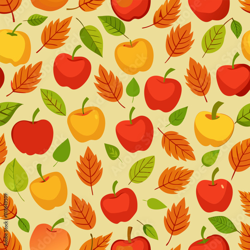 Autumn Apple Pattern: Red and Yellow Apples with Fall Leaves