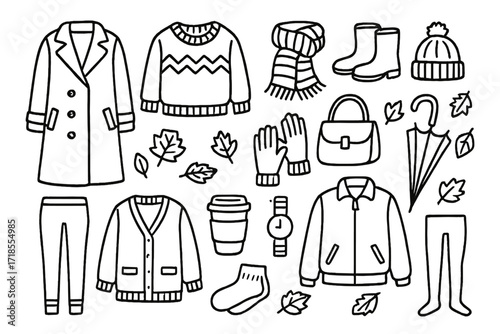 Autumn Attire Doodle. Hand-drawn doodle illustration [Layered autumn style] [coat, sweater, scarf, boots, hat, cardigan, gloves, bag, umbrella, leaves,