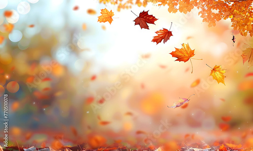 Autumn background with beautiful colorful leaves falling in the air and ground covered in fallen autumn leaves. Beautiful natural autumn landscape with colorful foliage in the park.