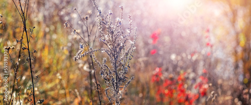 Autumn background with thickets of plants and weeds in a meadow in sunny weather