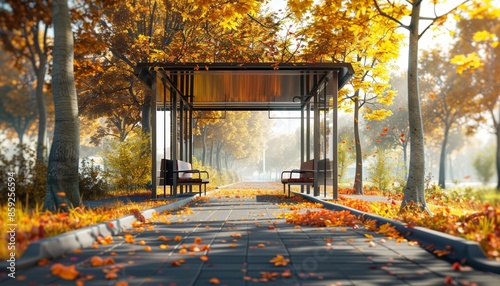 Autumn Bus Stop with Trees, Fallen Leaves, and Empty Bench, Sunny Day, Background with Copy Space