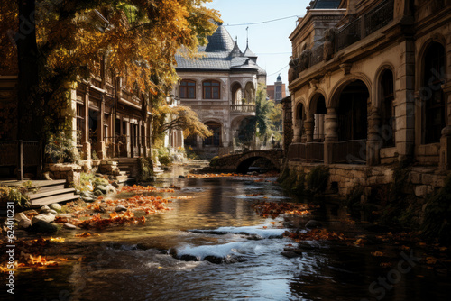 Autumn city rainy landscape, orange golden foliage, fall wallpaper, AI Generated