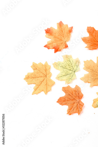 Autumn composition. Dried leaves on white background. Autumn, fall, thanksgiving day concept. Flat lay, top view, copy space