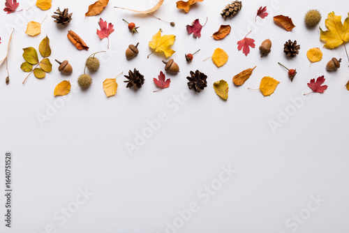 Autumn composition. Pattern made of dried leaves and other design accessories on table. Flat lay, top view