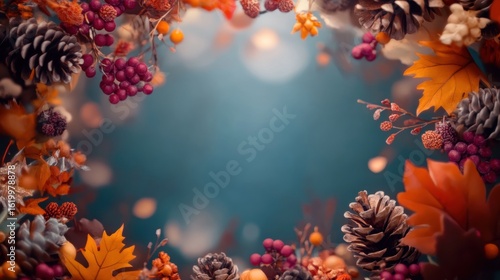 Autumn decor featuring colorful leaves and pinecones on a blurred background