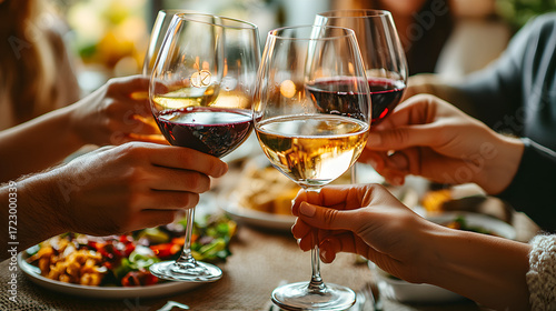 Autumn dinner party with group of friends at home, raising wine glasses in laughter, warm cozy candlelight and rustic table setting
