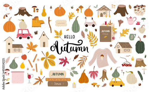 Autumn doodle illustrations - leaves, pumpkins, acorns, mushrooms, sweater, books, stumps. Fall season elements perfect for scrapbook, card, poster, invitation, sticker, etc. Vector illustration.