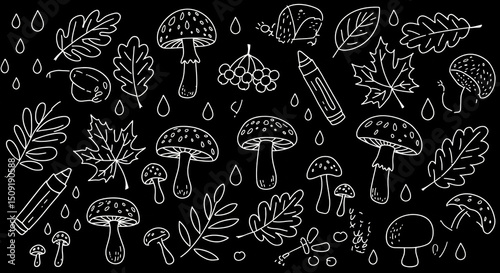 Autumn Doodle Magic Whimsical Forest Drawings of Mushrooms Leaves and Berries in White on Black