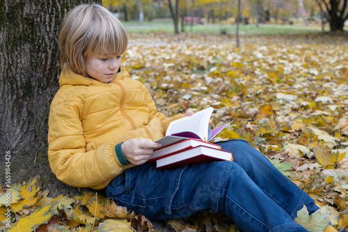 Autumn dreamy mood. I love autumn and books. A boy of 8 years old sits in the park near a tree on fallen yellow leaves and reads books. Back to school. Time to relax with benefit. Education concept