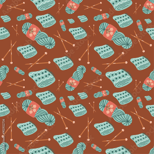 autumn elements, autumn blue plaid, knitting needles and a ball of yarn flat seamless pattern, cute cozy background, autumn season