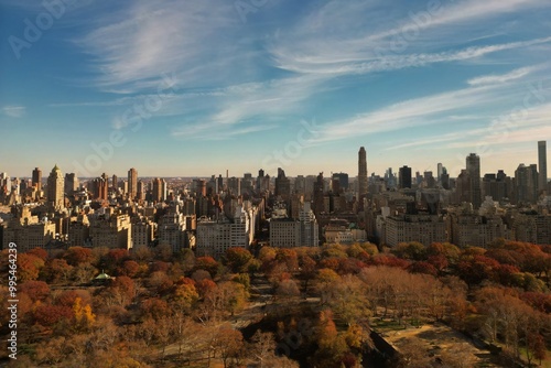 Autumn Fall. Autumnal Central Park view from drone. Aerial of NY City Manhattan Central Park panorama in Autumn. Autumn in Central Park. Autumn NYC. Central Park Fall Colors of foliage.