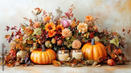 Autumn floral arrangement with pumpkins, candles, vibrant colors, seasonal decor