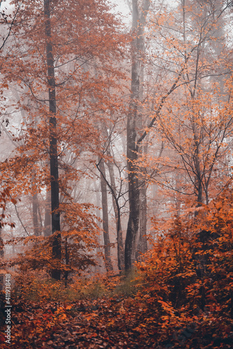 autumn foggy landscape in the middle of a wild deciduous forest. amazing multicolored leaves in the wild