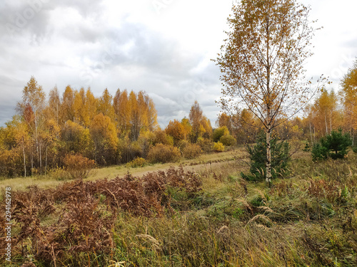 Autumn forest. Birch trees with yellow leaves, green pine trees and wilting grass.