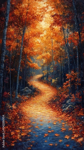 Autumn Forest Path Illustration - A Painting of Golden Leaves, Trees, and a Winding Path