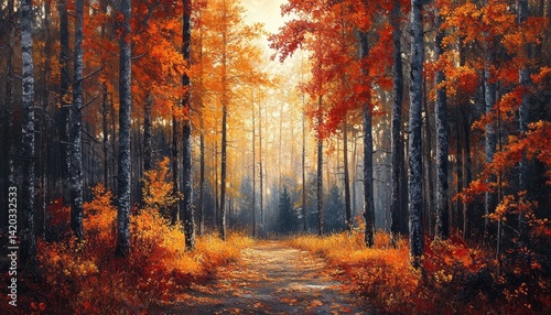 Autumn forest path lined with vibrant orange and yellow leaves during sunset in a serene wooded area