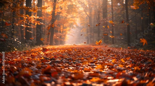 Autumn forest path with fallen leaves, golden light, misty atmosphere