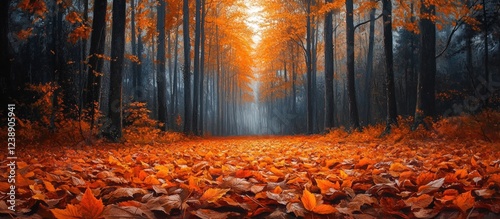 Autumn Forest Pathway Covered with Fallen Leaves and Tall Trees