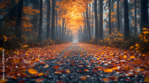 Autumn Forest Pathway Covered with Vibrant Orange Leaves