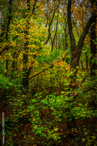 Autumn forest with green and yellow trees,october forest landscape.Fallen trees in the frame.Green colors.Mystery woodlands.Maple trees and leaves.Morning landscape.Camping in the forest