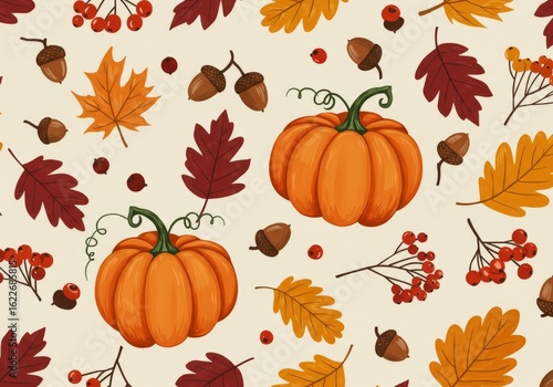 Autumn Harvest Delight, Pumpkins, Leaves, Acorns and Berries Seamless Pattern