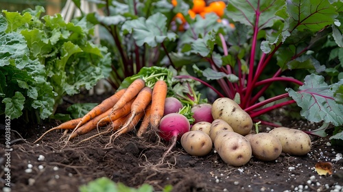 Autumn harvest fresh raw potatoes carrots and beets in the garden