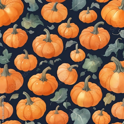 Autumn harvest illustration featuring numerous vibrant orange pumpkins against a dark background, interspersed with green leaves. Perfect for fall-themed projects.