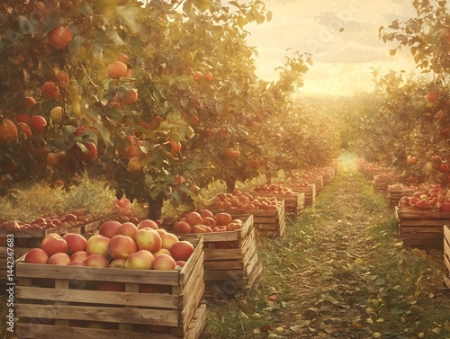 Autumn Harvest in Apple Orchard: Scenic Rural Landscape with Bountiful Apple Crates, Vibrant Fall Colors, and Golden Hour Tranquility