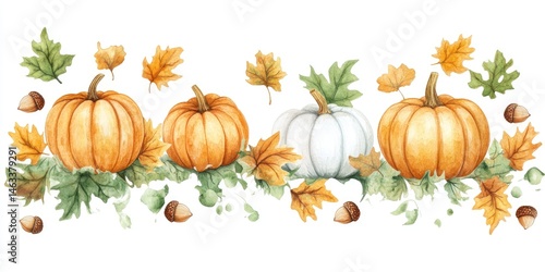 Autumn Harvest Watercolor Painting: Pumpkins, Leaves, and Acorns in a Festive Fall Composition
