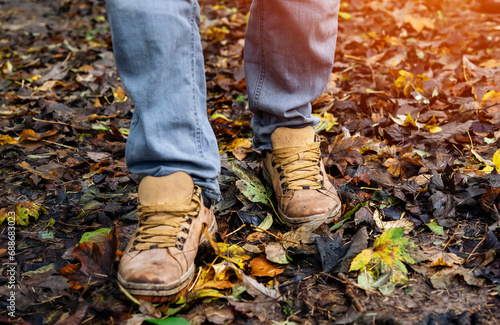 Autumn hiking trough high grass in the wood. Close-up of walking in the forest