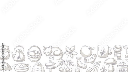 Autumn horizontal banner or background with space for text. Minimalist bottom border frame with monochrome gray fall seasonal cozy elements, food, clothes, mushrooms, animals. For poster, flyer, card