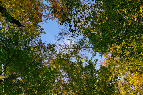 Autumn in the forest with sun rays. Green, orange and yellow leafs in autumn time in a Swiss forrest