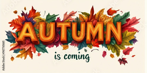 Autumn Is Coming Text with Colorful Leaf Pattern