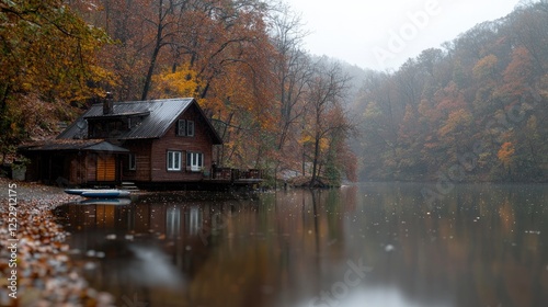 Autumn lake house, misty forest, calm water, fall foliage, nature retreat
