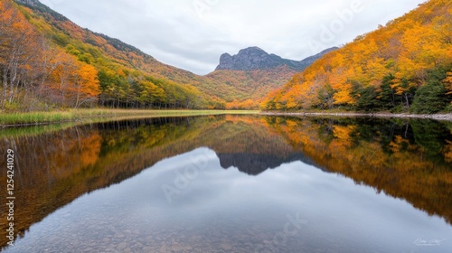 Autumn lake reflecting fall foliage mountains