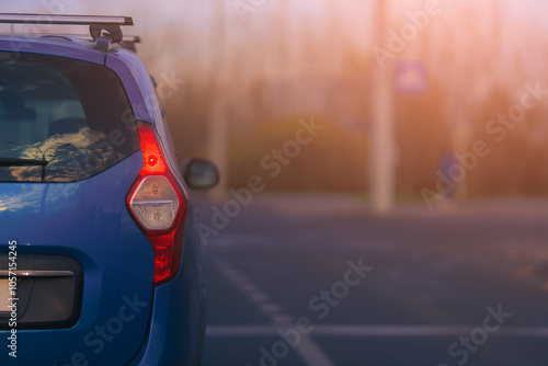 Autumn landscape and view of the road with cars. Orange evening sun and reflections on cars.