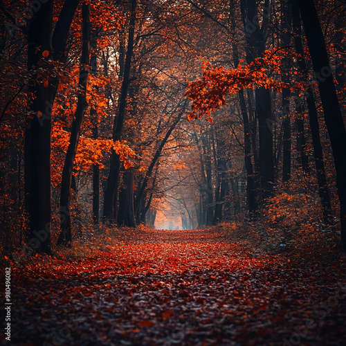 Autumn Landscape background - Trees And Orange Foliage In Park At Sunset