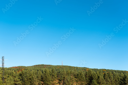 Autumn landscape green warm orange forest with clear blue sky on sunny day