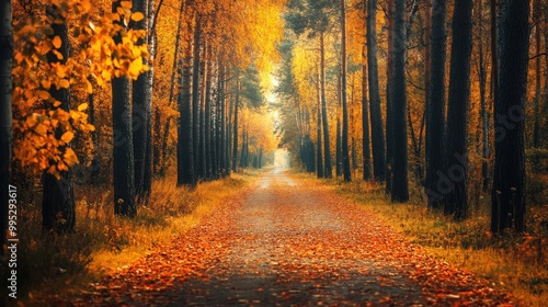 Autumn landscape in Eastern Europe with a magical forest path, colorful foliage in yellow and orange, and tree trunks lining the serene road
