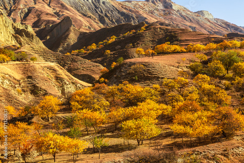 Autumn landscape with colorful trees and mountains covered with trees. Dagestan, Russia