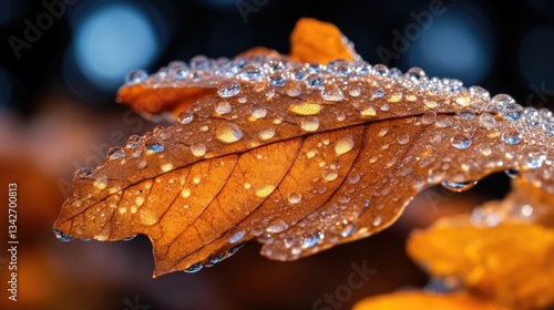 Autumn leaf covered in dew drops. Close-up view of a glistening, orange-brown leaf with water droplets