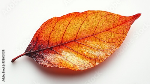 Autumn Leaf Delicate: A single, vibrant orange leaf, showcasing the intricate veins and delicate texture, resting on a pristine white background. The warm colors and intricate details evoke a sense of