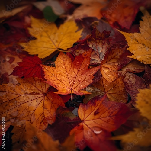 Autumn leaves background. A close up of many orange and red leaves. The leaves are wet and appear to be falling from a tree. Concept of autumn and the beauty of nature.