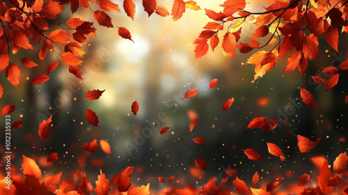 Autumn leaves falling in a forest, creating a beautiful and colorful scene.