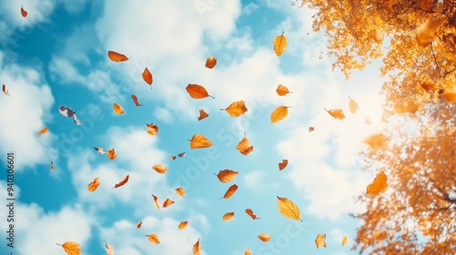 Autumn Leaves Falling Through Blue Sky, Photograph, Nature, Falling Leaves, Autumn , Golden Leaves, Sky