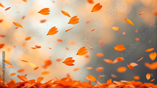 Autumn leaves floating gracefully through soft blurred background with warm orange and golden tones creating dreamy seasonal atmosphere.