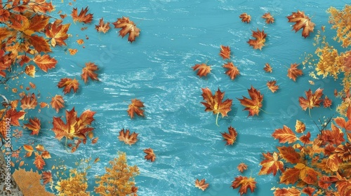 Autumn leaves floating on a turquoise water surface, creating a tranquil and mesmerizing seasonal scene.