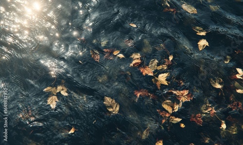 Autumn leaves floating on the calm surface of a water stream, with sunlight reflecting on the ripples, capturing the serene fall season's beauty